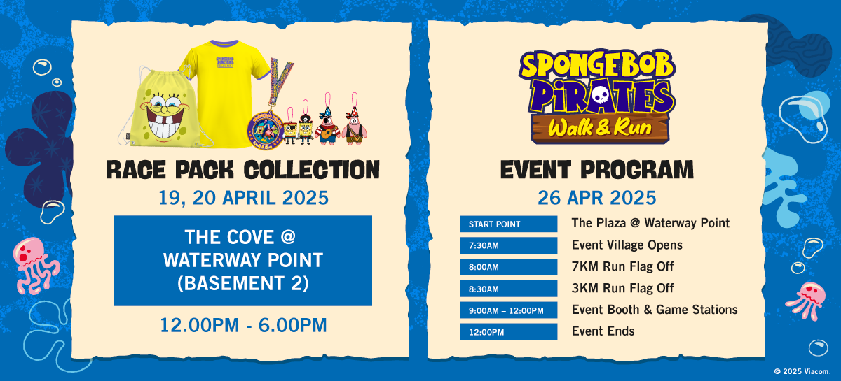 The SpongeBob Pirate Walk and Run starts at Waterway Point and offers an interactive 3km walking route and 7km running route to Punggol Waterway Park.